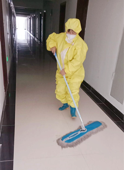 说起来轻松的工作,实际上并不轻松。进入宿舍楼前,她们都要身穿防护服,戴好口罩、防护帽子、一次性乳胶手套等防护措施,每天测量体温正常后方才进入隔离区。她们严格按照公司规定,对隔离区的日常生活垃圾进行消杀、密闭清运到指定堆放点统一处理,并对宿舍走廊、楼梯等区域进行清扫、消毒。近期返岗需要隔离的员工逐渐增多,这也给清扫、消毒等工作增加了一定的压力。但刘当仙和殷冬仙两人毫无怨言、分工合作、配合默契,每天都按时完成整栋宿舍楼的清洁卫生工作,给员工提供了一个干净、整洁、安全的隔离环境。