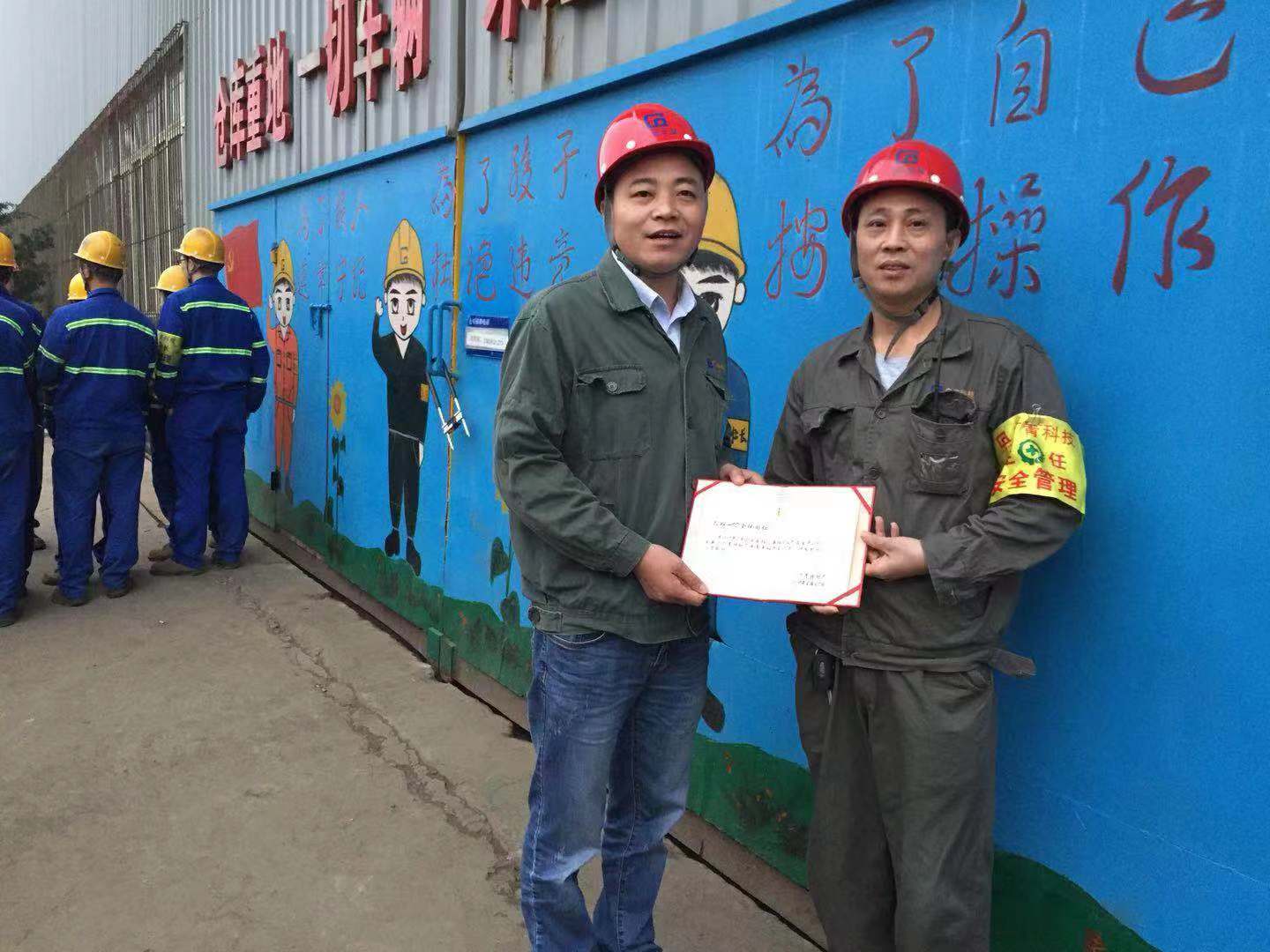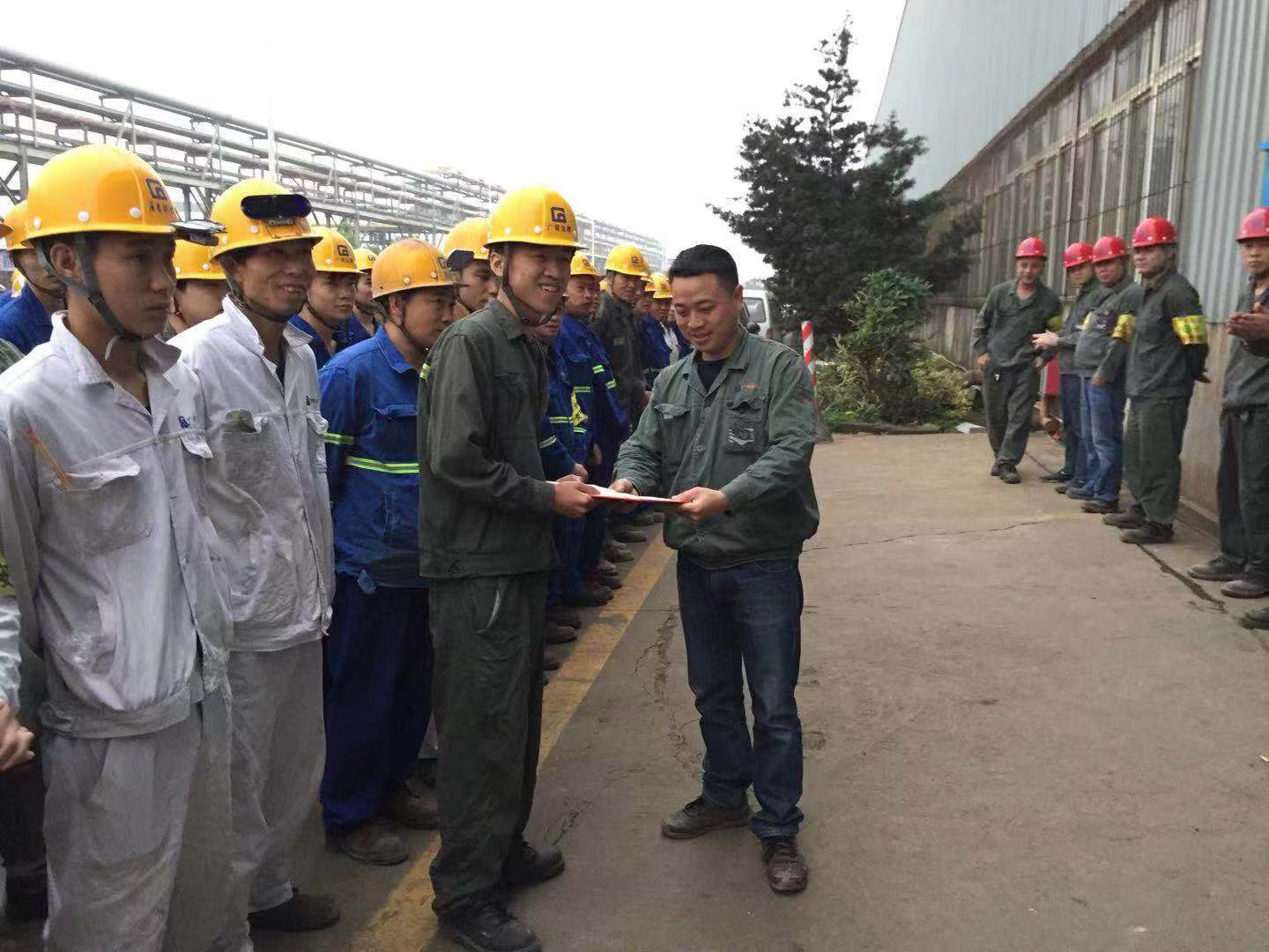 2月27日,广青科技副总经理刘光勇和炼钢厂厂长尹帮伍前来早班会现场祝贺,并给创造纪录的横班值班主任尹帮林颁发了荣誉证书,表彰了AOD配气员尹鑫、李建高等员工,同时鼓励炼钢厂员工要团结一致,在保证安全、保质保量、节能降耗的前提下再创佳绩。