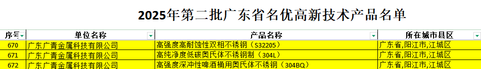 11月24日,广东省高新技术企业协会正式公布2025年第二批广东省名优高新技术产品名单,广青科技“高强度高耐蚀性双相不锈钢(S32205)”“高纯净度低碳奥氏体不锈钢制(304L)”和“高强度深冲性啤酒桶用奥氏体不锈钢(304BQ)”三项产品成功入选,彰显了广青科技在高端高品质不锈钢生产制造领域突出的技术实力、卓越的产品质量与领先的品牌影响力。